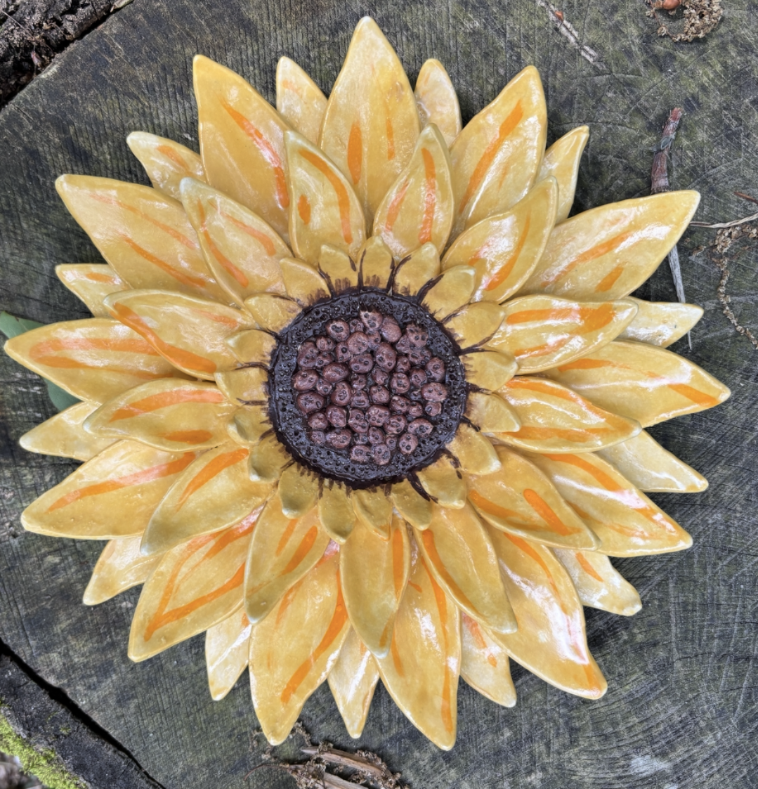 Create a bright and cheerful clay sunflower. Glaze it in golden yellow and orange.