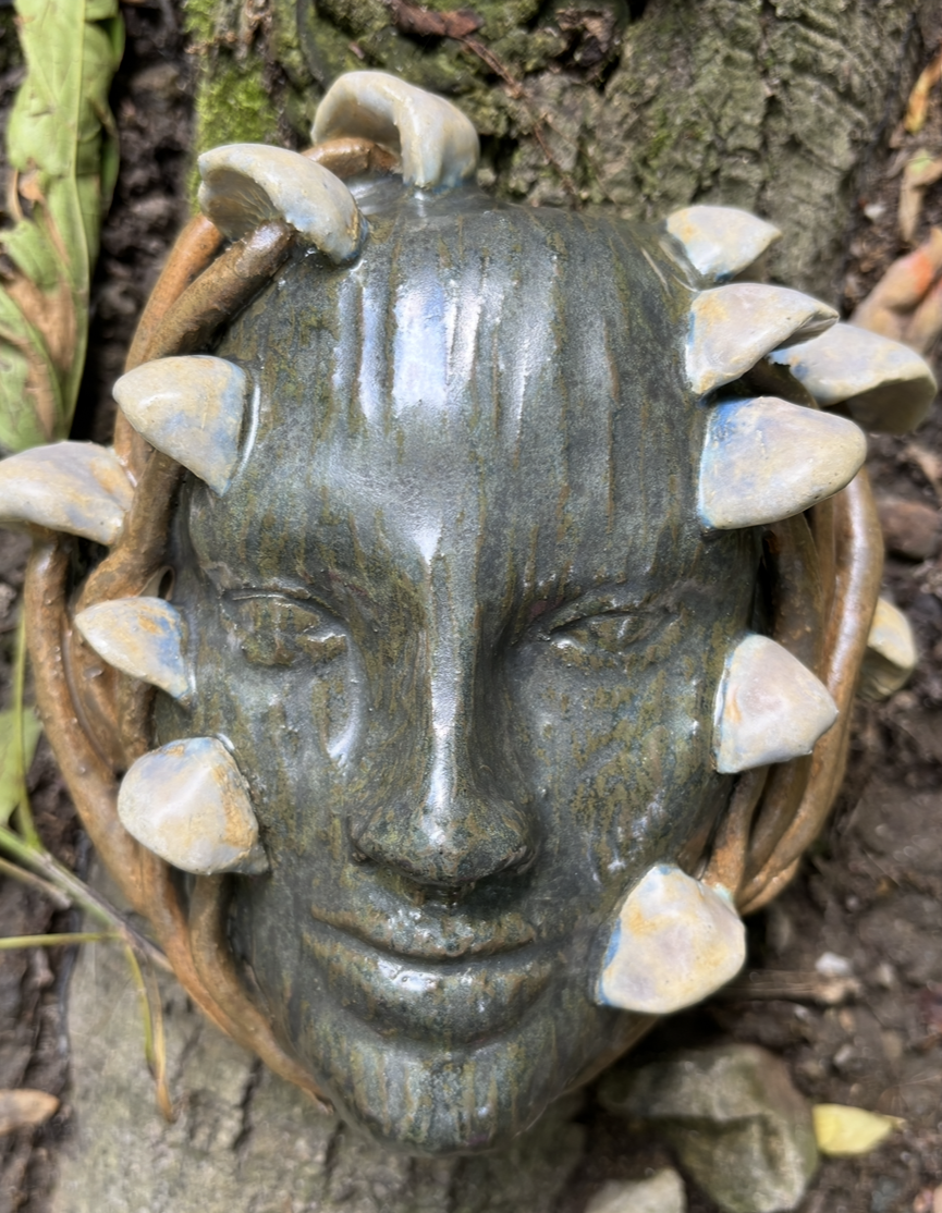 Press clay in to a mold to create the sculpted face and adorn it with natural imagery of your choice: mushrooms, flowers, leaves, or butterflies. This can be a wall hanging or made into a planter.