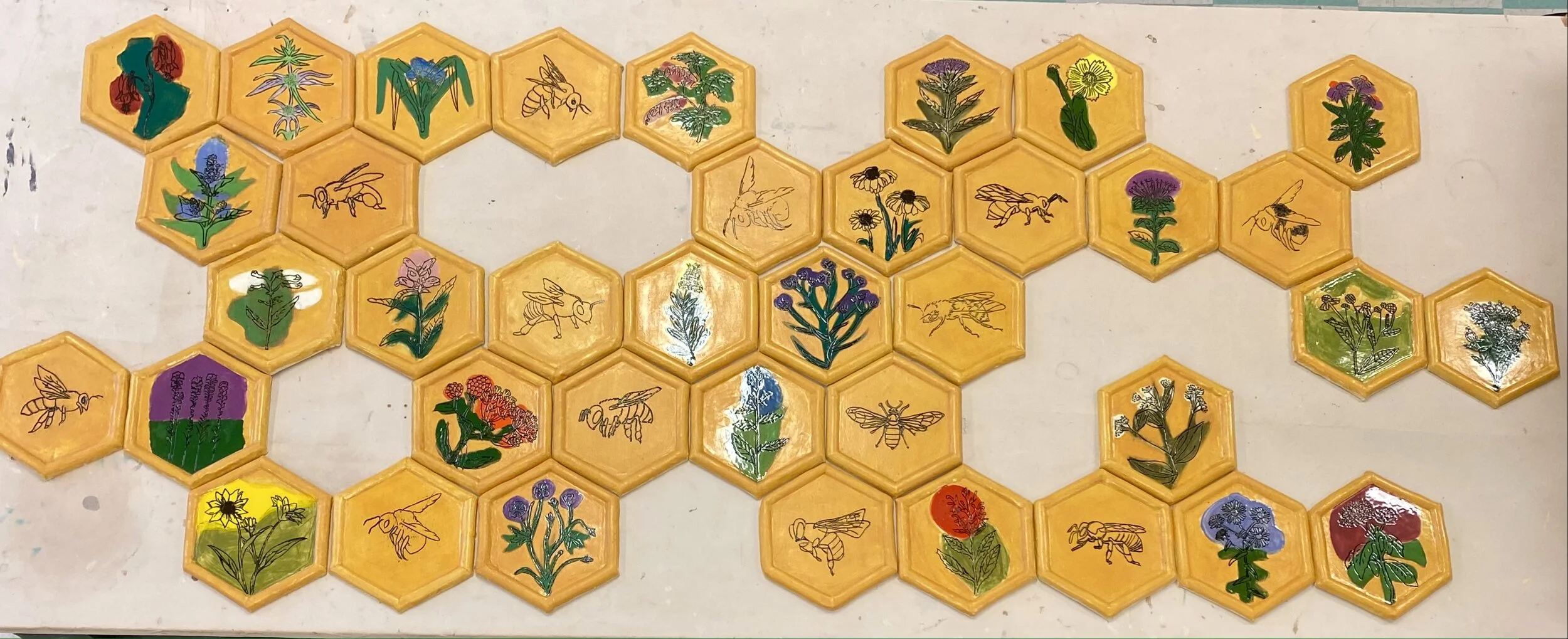Students in my Art for a Changing World: Studies in Environmental Art—a course as the Humanities component of the Connective Experience, “Web of Life”—created a ceramic tile art installation to bring awareness to the decline of bees populations due to pesticides, drought, habitat destruction, nutrition deficit, air pollution, and global warming. The students created hexagon shaped tile pieces to form a bee hive effect once installed. Bright colors of native wildflowers of Pennsylvania were painted on the leather hard clay surface and wax resist was applied over that. Then the students traced outlines of flowers over top creating and embossed line. The line was then removed to reveal the raw clay underneath. Black underglaze was applied to the lines and cleaned with a sponge leaving just the outline of the flower. I applied a clear glaze later.