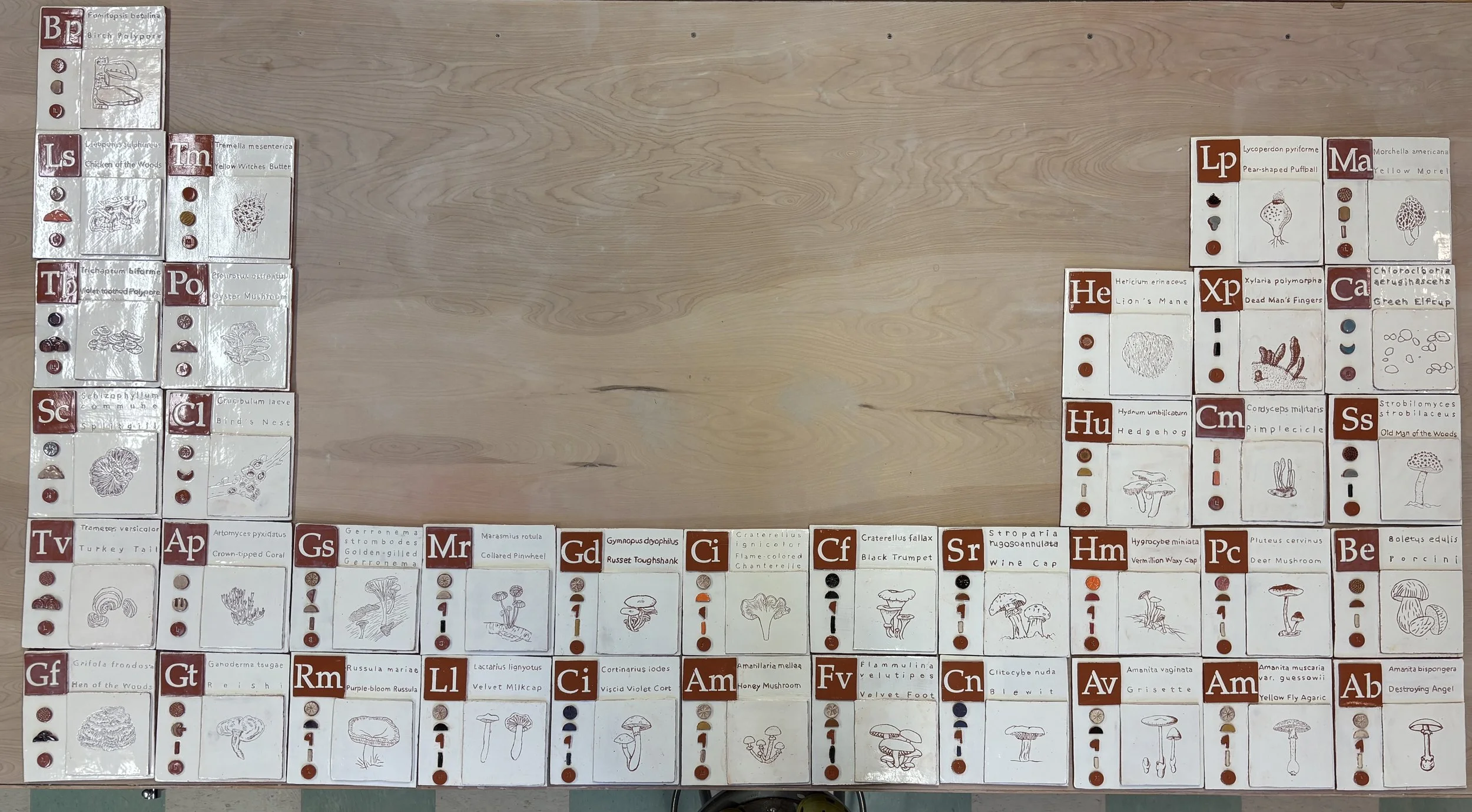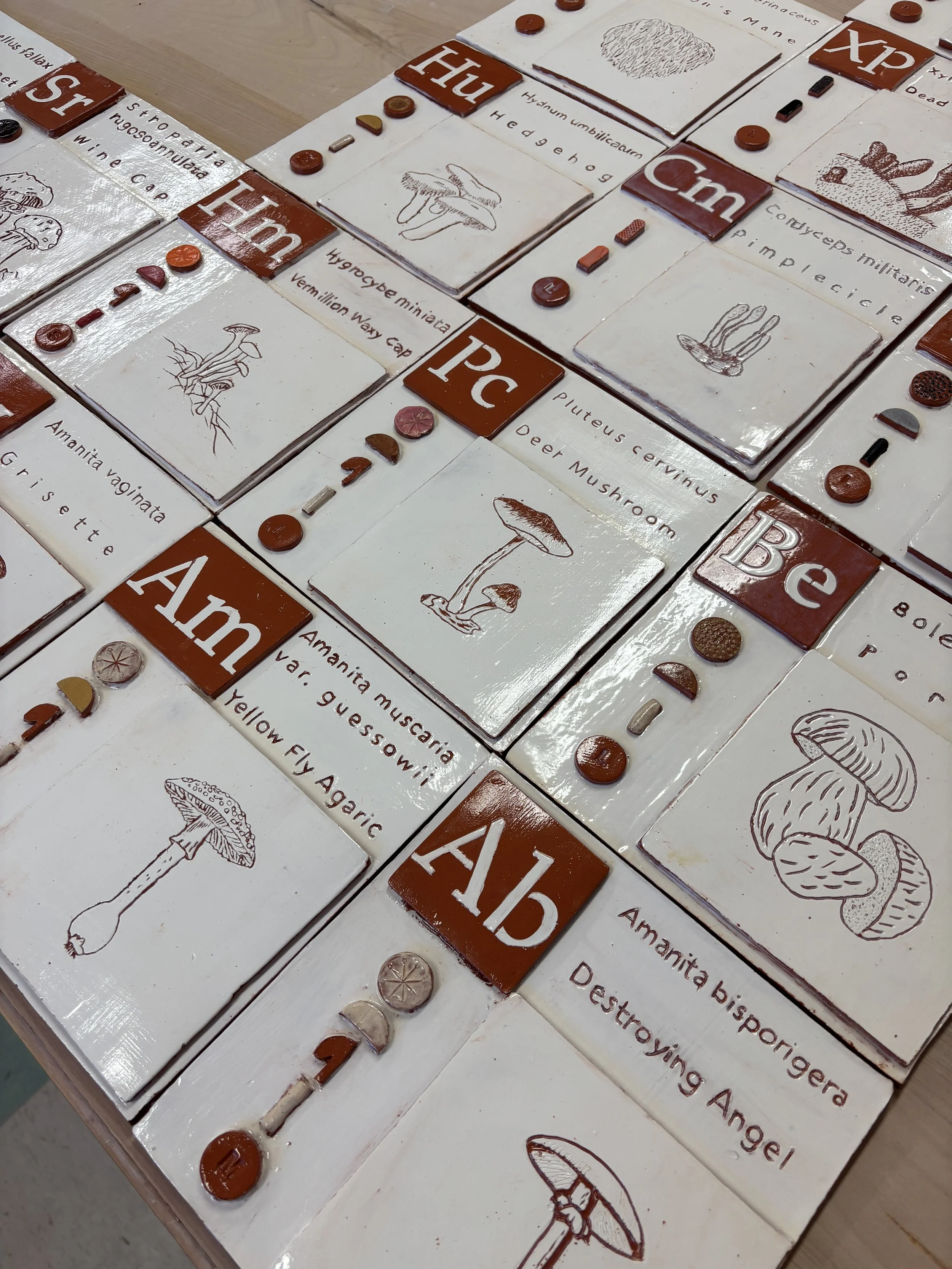 Fall 2023 students in my Art for a Changing World: Studies in Environmental Art—a course as the Humanities component of the Connective Experience, “Web of Life”— indulged my interest in mushrooms to assist me in creating this ceramic tile installation. Students did the research of the various keys that are used to identify the selected fungi. This installation was created to help people understand and appreciate mushrooms as wildlife. Illustrating some of the most commonly encountered and characteristic species you might find growing in central Pennsylvania.