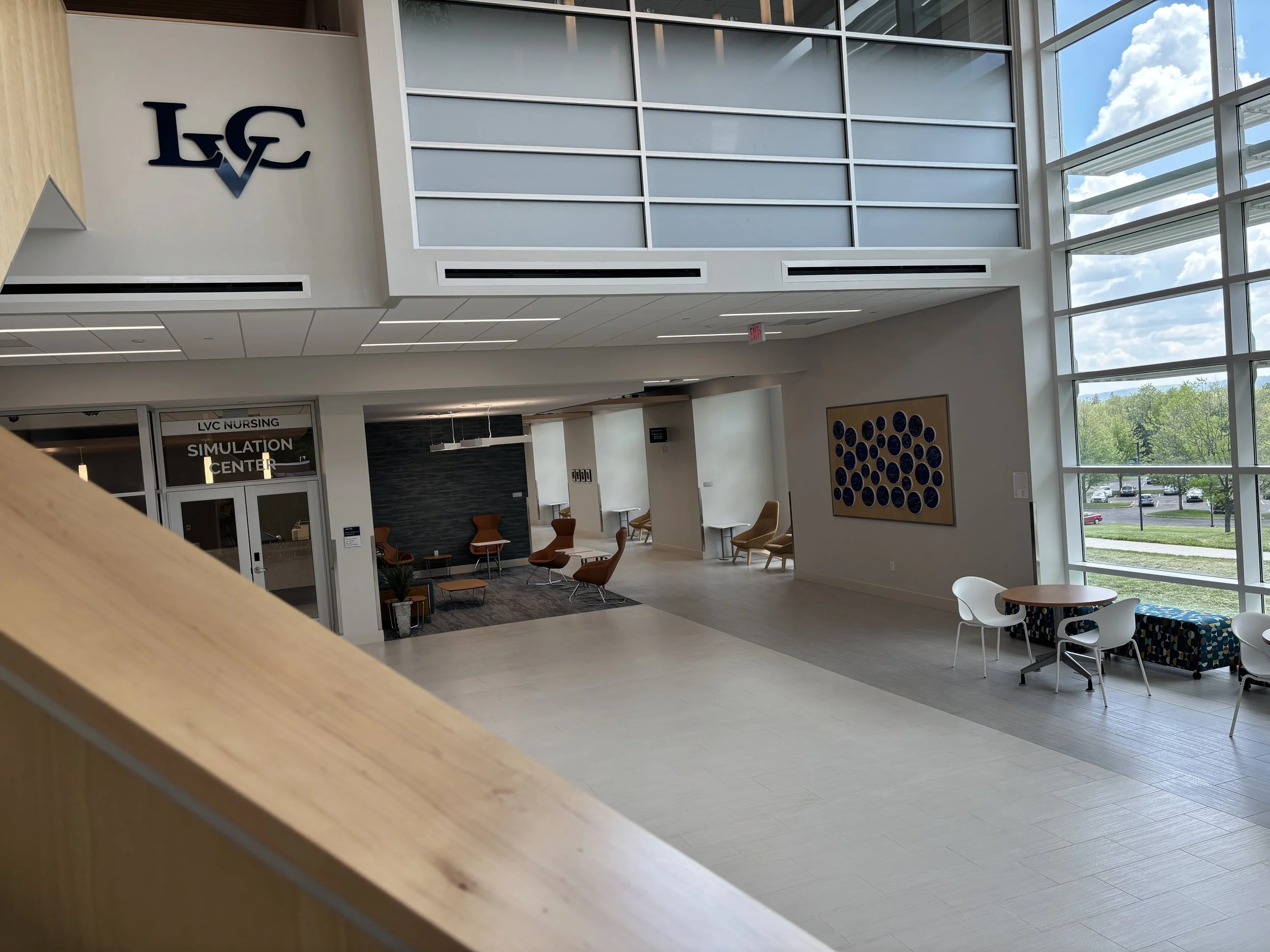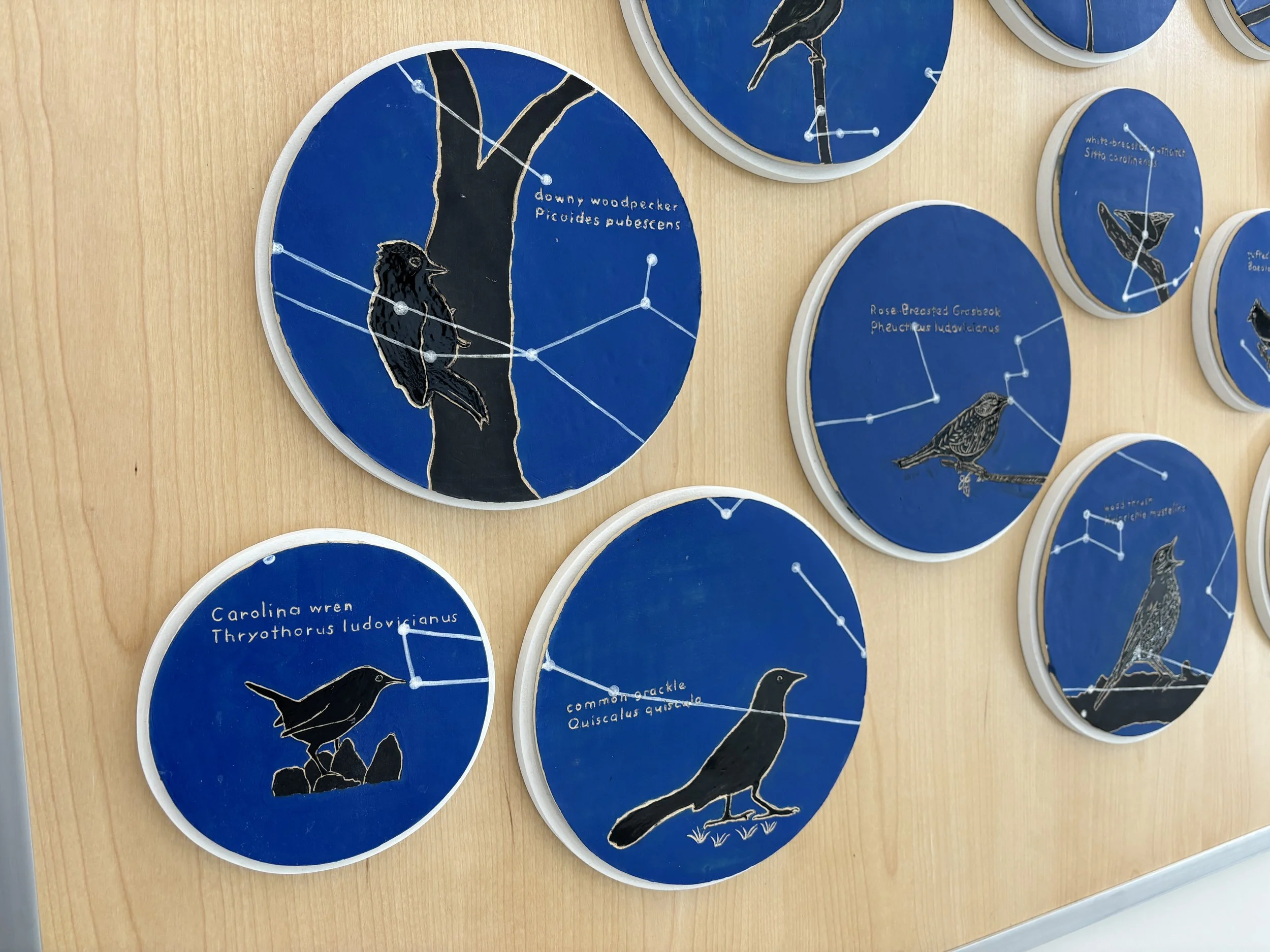 In the early spring of 2020, students in Karen Beall’s in Art for a Changing World: Studies in Environmental Art—a course as the Humanities component of the Connective Experience, “Web of Life”—created a ceramic tile art installation. The students created line drawings (a technique called sgraffito), on clay tiles of individual birds, along with their scientific and common names of birds found in the Wood Thrush Preserve on the Lebanon Valley College campus. The birds are depicted in glossy black silhouette on a matte electric blue background reminiscent of dusk light. The tiles also contain white dots and lines that represent constellations which reflects the migratory nature of birds. The installation was created to bring awareness to the fact that two-thirds of North American bird species are at risk of extinction from climate change. The primary cause of species decline are the loss, fragmentation and degradation of habitat. Understanding the reason for population changes in migratory species requires careful consideration of conditions in all the places where the species spends part of its life. It was installed in the Nursing Education Building on the campus of LVC, Annville, PA in Spring 2024.