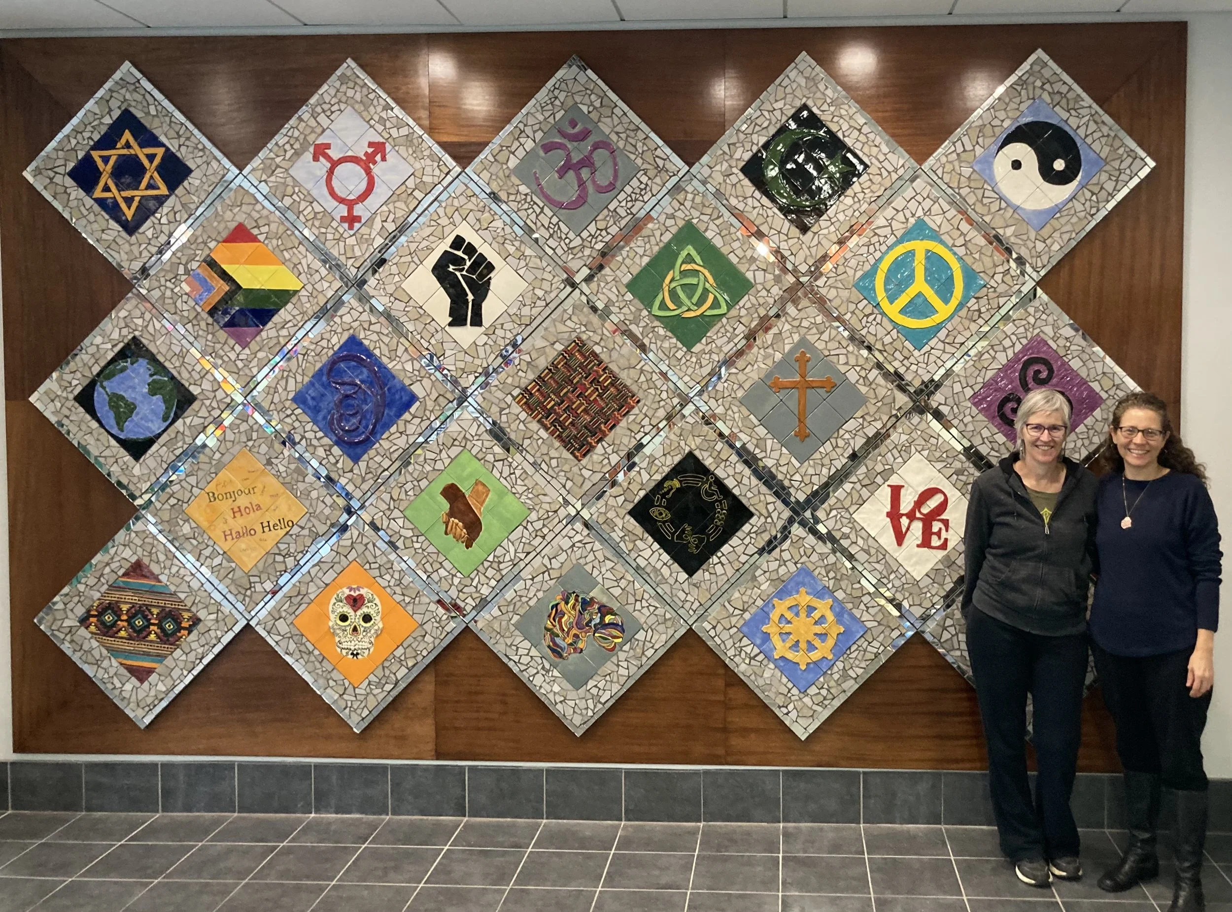 The students started by developing surveys to poll the faculty, staff and students about the theme of diversity, equity and inclusion. They also met with different campus clubs and individuals that were willing to share their points of view. The data gleaned from the surveys and meetings were used to solidify ideas into visual concepts. With these concepts in mind, students developed public art proposals which they presented to the class and a panel which selected three proposal finalists. The proposal finalists were displayed in the Bishop Library where the campus community voted for their favorite. Amelia Mantione’s proposal of a quilt containing different cultural and social symbols was selected. The class worked together to realize the proposal’s conceptual design into a tile mosaic. The mural was created for an indoor setting and would be installed at a later date so it was constructed on individual panels. Each student chose a clay surface technique and glaze colors for their two tile emblamatas. Once the clay emblamata’s were made, fired and adhered to the panel surface, cut stone tile pieces in various shades of gray were added along with a border of mirrored tiles. The mural was then grouted. The finished mural was installed in the Allan W. Mund College Center in late 2022 and unveiled to the campus community on Martin Luther King day, January 2023.