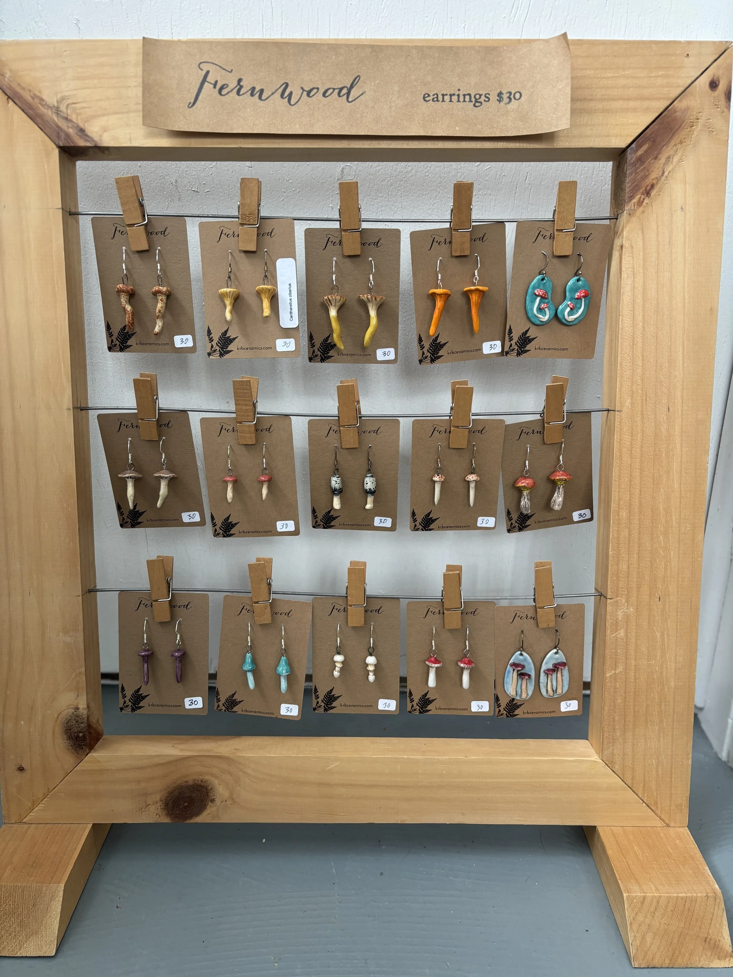 These fun little fungi are created out of polymer clay and are based on real mushrooms! They are attached to stoneware clay that has been impressed with real tree bark from my Pennsylvania property. The clay disks vary in size and are priced according to size.